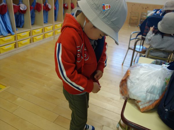 写真日記2020 12月1日 年少クラス 帰りの支度 2020.12.02年少クラス 帰りの支度です。制服を着たり、上着のジッパーを締めたり、持ち帰りの荷物を結んだり…。ひとりで頑張っていますよ。 2020 12月1日 年少・年長 渋谷先生の体育指導前の記事 2020 12月1日 戸外遊び次の記事