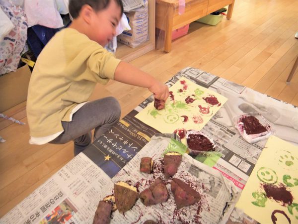 写真日記2021 11月24日 年少クラス いもスタンプ 2021.11.25年少クラスの子どもたちは自分たちで掘ったおいもを使っていもスタンプに取り組みました。 2021 11月22日 年長クラス 楽器遊び前の記事 2021 11月25日 誕生会次の記事