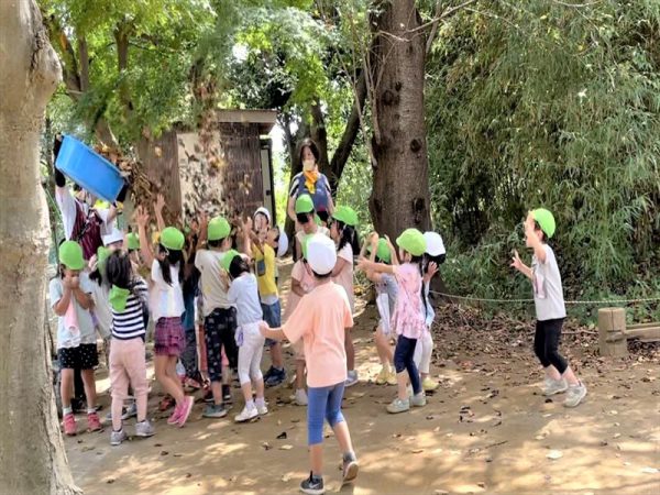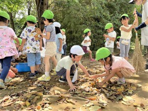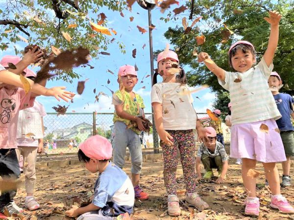 年中クラスの子どもたちは落ち葉を集めたり降らせたり…。