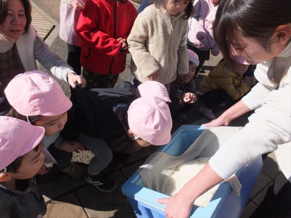 写真日記2022 12月19日 おもちつき④ 2022.12.192グループめ。ホカホカのもち米をみんなで観察。「これがおもちになるんだね」興味津々で見ています。 2022 12月19日 おもちつき③前の記事 2022 12月19日 おもちつき⑤次の記事
