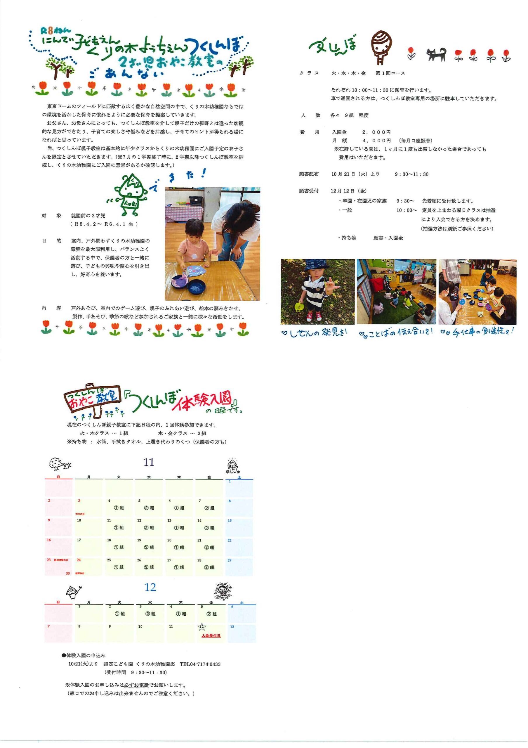 令和8年度つくしんぼ親子教室のご案内&体験入園の日程ができあがりました! 2025.10.15 未就園児の方へ 2025 10月20日(月)沼南社会福祉センターにて「おやこで・つくって・あそぼ」開催します!前の記事