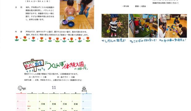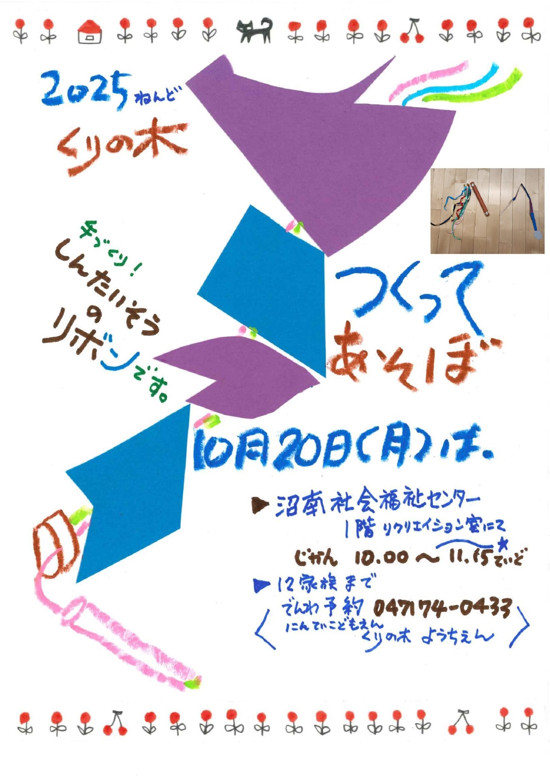 2025 10月20日(月)沼南社会福祉センターにて「おやこで・つくって・あそぼ」開催します! 2025.10.06 未就園児の方へ今回は沼南社会福祉センターさんにて森田副園長による造形イベント「おやこで・つくって・あそぼ」を開催します。 10月20日(月)10:00~ 同センターの1階レクリエーション室で行います。今回は新体操のリボンを手作りします。参加を希望される方は電話にてご予約下さい。ご参加お待ちしています。沼南社会福祉センターさんをお借りするのは初めての試み!会場は国道16号ヤマダ電機さんの近くです。 令和8年2,3号(保育園部分)説明会のお知らせ前の記事 2025 10月12日 運動会次の記事